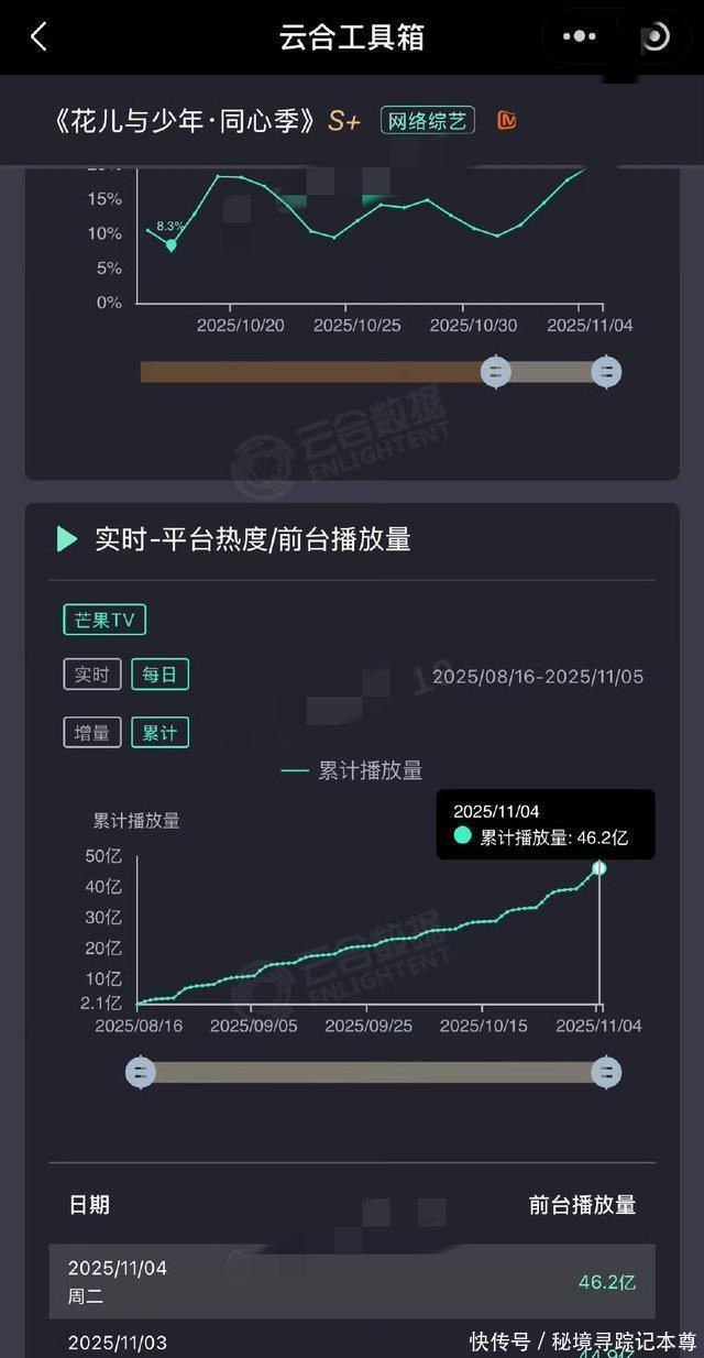 更别说,有网友拉出了《花儿与少年7》从8月16号到11月4号的热度数据,截止到他拉出数据的时候,热度已经达到了46.2亿,足以可见这一季的《花儿与少年》究竟有多受大家欢迎。