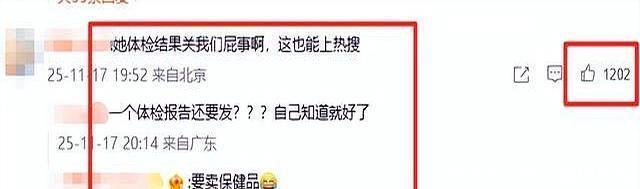 有人损得直接:“这状态是缺钙还是缺点玻尿酸?”还有人说,“没啥新鲜劲儿就别硬往热搜上挤了,体检报告谁关心啊?”更有甚者,直接拿她和章子怡比,明嘲暗讽地说她是不是看章子怡最近风头正劲,心里不平衡。